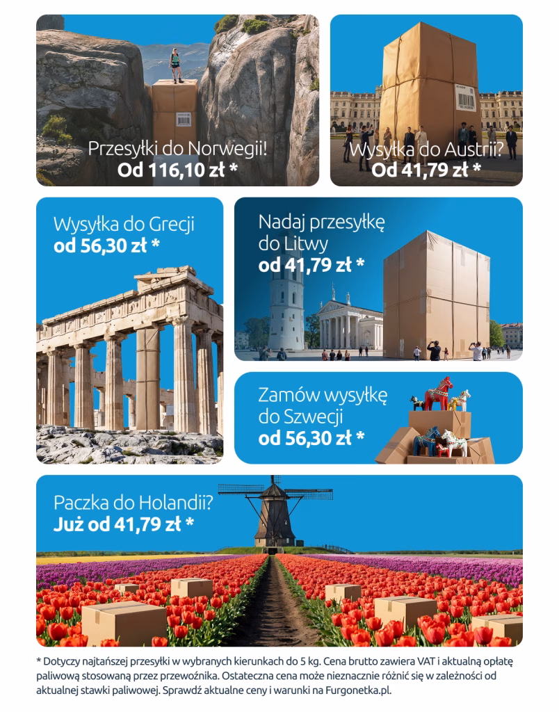 *Ceny dotyczą najtańszej przesyłki w wybranym kierunku do 5 kg. Cena brutto z VAT i opłatą paliwową obowiązującą na dzień 17.11.2025 r. Ostateczna cena może ulec zmianie w zależności od aktualnej stawki opłaty paliwowej ustalanej przez przewoźnika. Sprawdź aktualne ceny i warunki na Furgonetka.pl