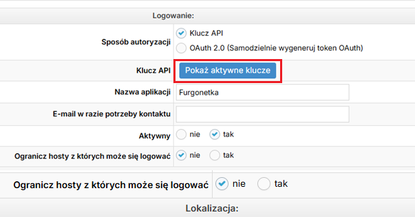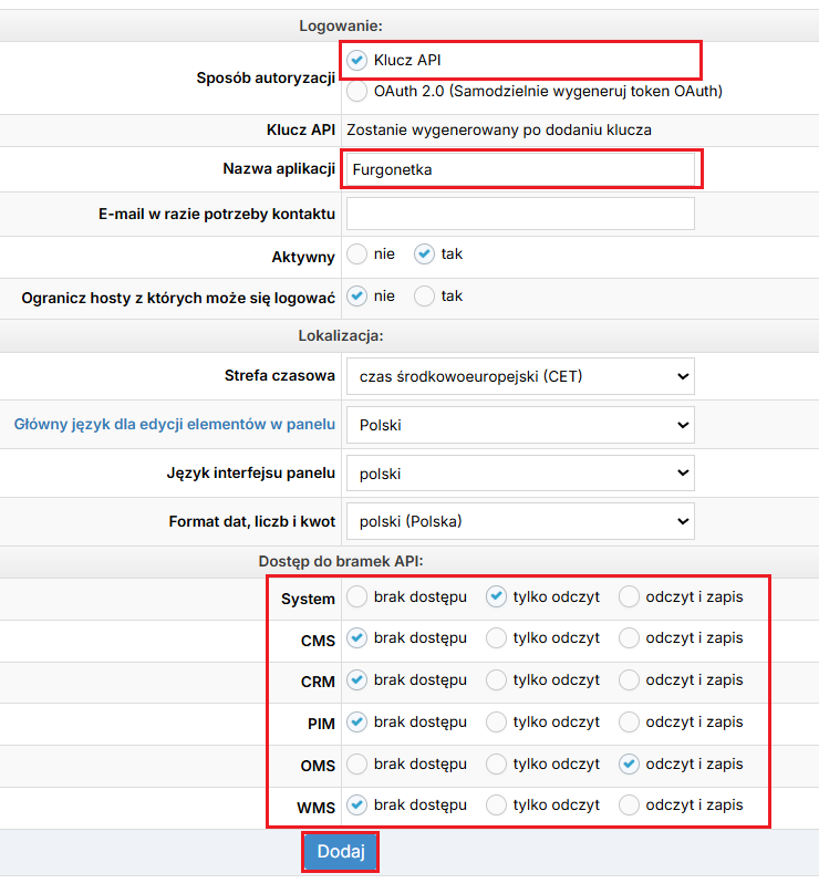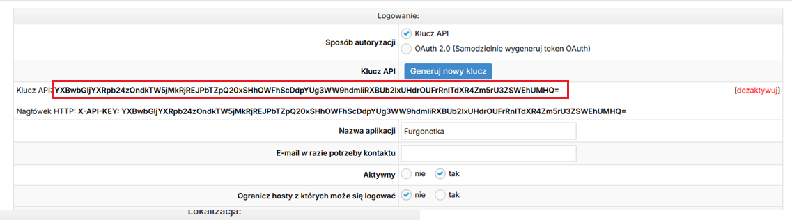 - jako sposób autoryzacji wybrana jest opcja Klucz API,