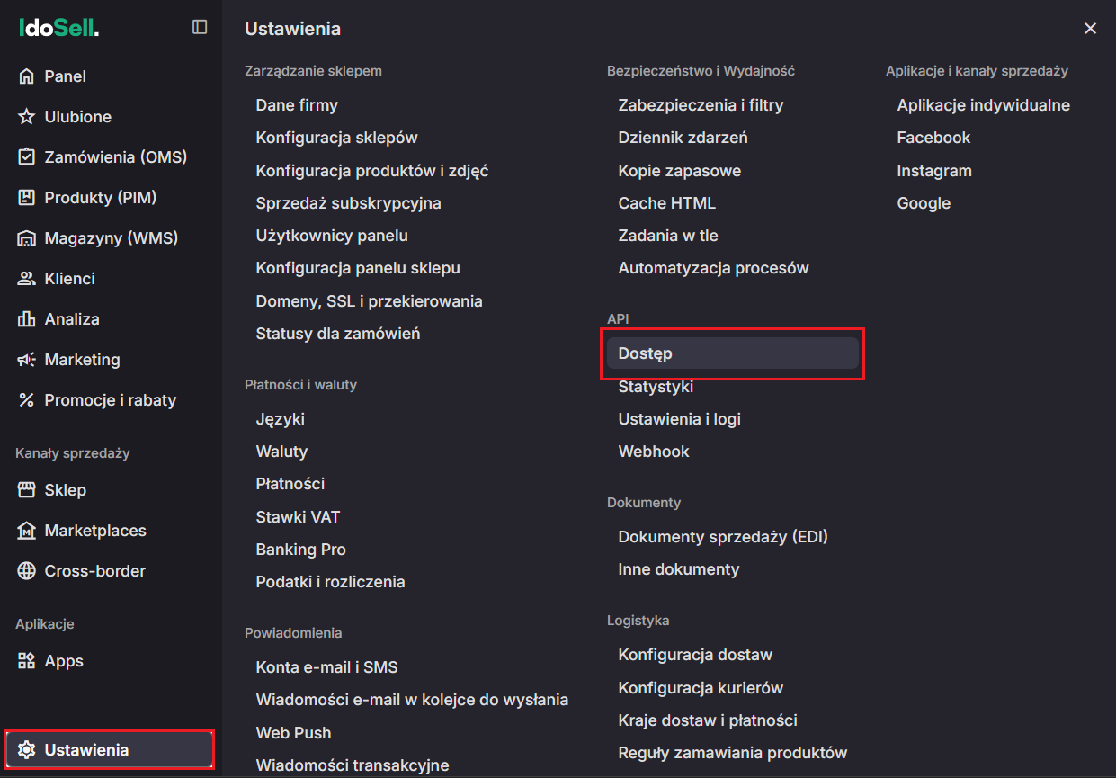 Krok 1 Zaloguj się do panelu swojego sklepu. Następnie w menu po lewej stronie wybierz Ustawienia > w API: Dostęp.