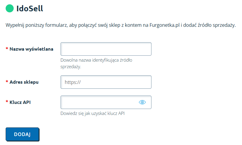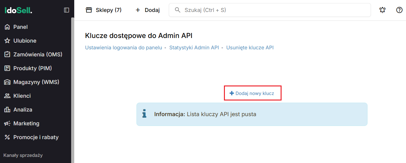 - Klucz API (unikalny klucz, stworzony w IdoSell)