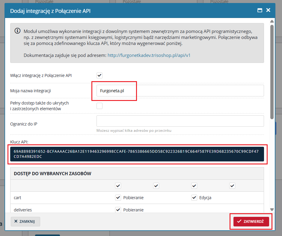 Krok 5 W oknie z formularzem wpisz nazwę integracji, np. Furgonetka.pl. Skopiuj klucz API i zatwierdź zmiany.